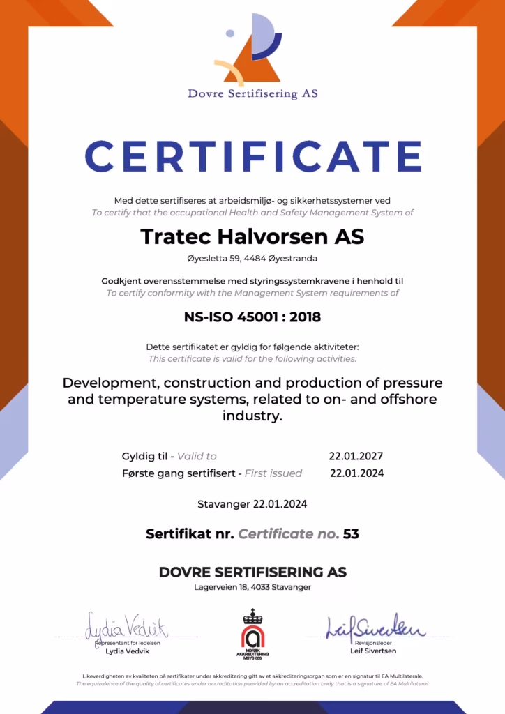 Hos oss i Halvorsen er kvalitet og sikkerhet det viktigste, og våre systemer er derfor sertifisert ihht. ISO-9001, ISO-14001, ISO-45001, i tillegg godkjenninger for sveis og trykktanker.