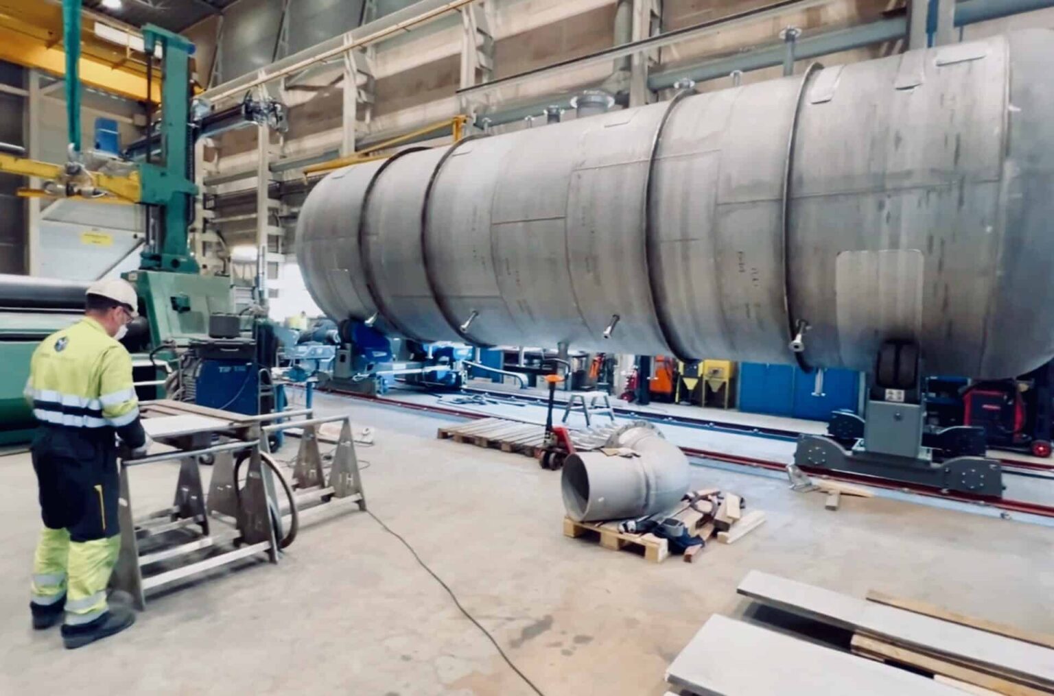 Den 18,5 meter lange coalesceren som bygges i verkstedet tar form.