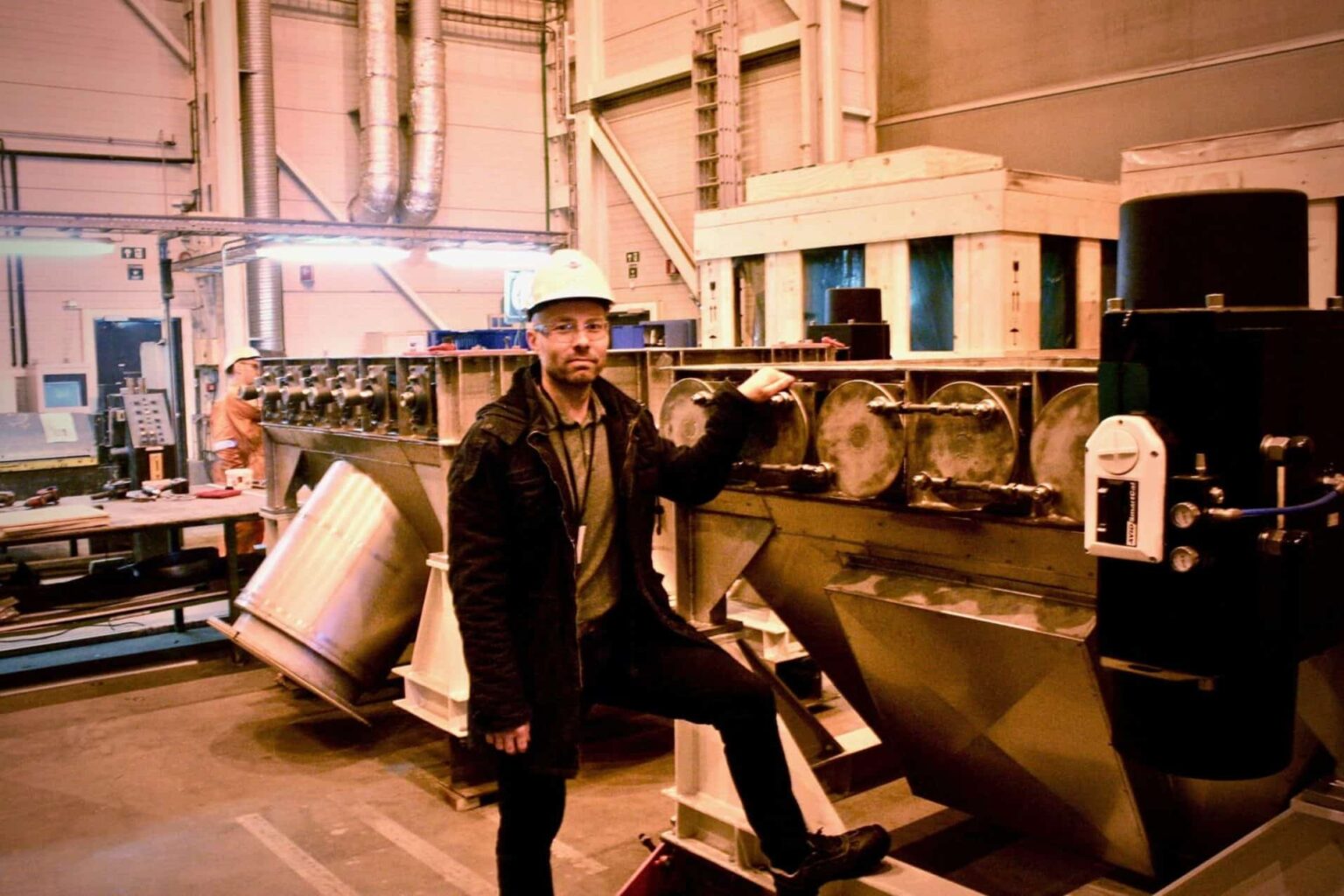 Kjell Vidar Netland ved en av varmevekslerne som snart skal installeres i Nordsjøen.